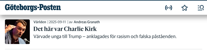 Den 10 september mördades Charlie Kirk. Här ovanför är en skärmdump av GP:s rubriksättning dagen därpå.
