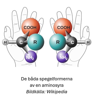 - En av de naturligt förekommande aminosyrorna – glycin – saknar spegelbildsform. Det beror på att den har en väteatom på den plats där det står ett R i figuren, och då har kolatomen bara tre olika atomgrupper knutna till sig. I de övriga 19 aminosyrorna sitter det på R:ets plats en större eller mindre kedja av kolatomer.     ↩
